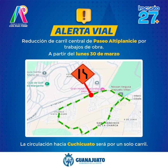 A partir del lunes 6 de abril, la circulación vehicular se realizará por el carril ya concluido de la calle Paseo Altiplanicie, en el tramo que va de Paseo del Verano hacia la salida a Cuchicuato. De manera simultánea, se cerrará el carril sur para permitir el desarrollo de las labores durante la Semana de Pascua, del 6 al 11 de abril.